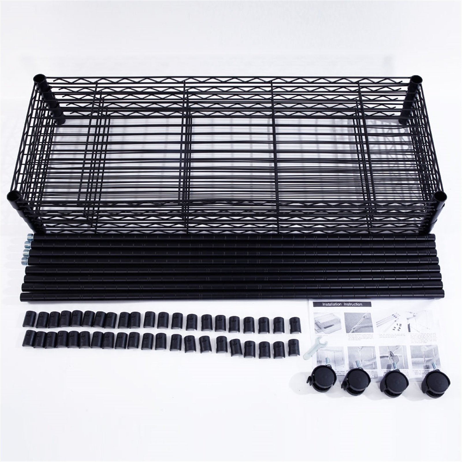 Note:1.When receiving the goods, please confirm the product according to the listing of instructions. Once you find Less pieces, please provide relevant pictures to contact us. We will deal it in the time.2.Please install goods with the instruction manual.3.It is recommended that the installation should not be too tight to adjust easily. After the structure is installed, firm the interface for more stability.Specifications:1. Material: Iron2. Height of Each Layer: 17.72" / 45cm3. Color:Black4. Dimensions: (35.43 x 13.78 x 65)" / (90 x 35 x 165)cm (L x W x H)5. Weight: 370 oz / 10.5 kg6. Layer Quantity: 5 Pcs7. witn Nylon Wheel: Yes8. Nylon Wheel Size: 1.5 inch9. Static Weight Capacity: 176 lbs / 80kg10. Dynamic Weight Capacity: 66 lbs / 30kgPackage Includes:4 x Meshes8 x Tubes