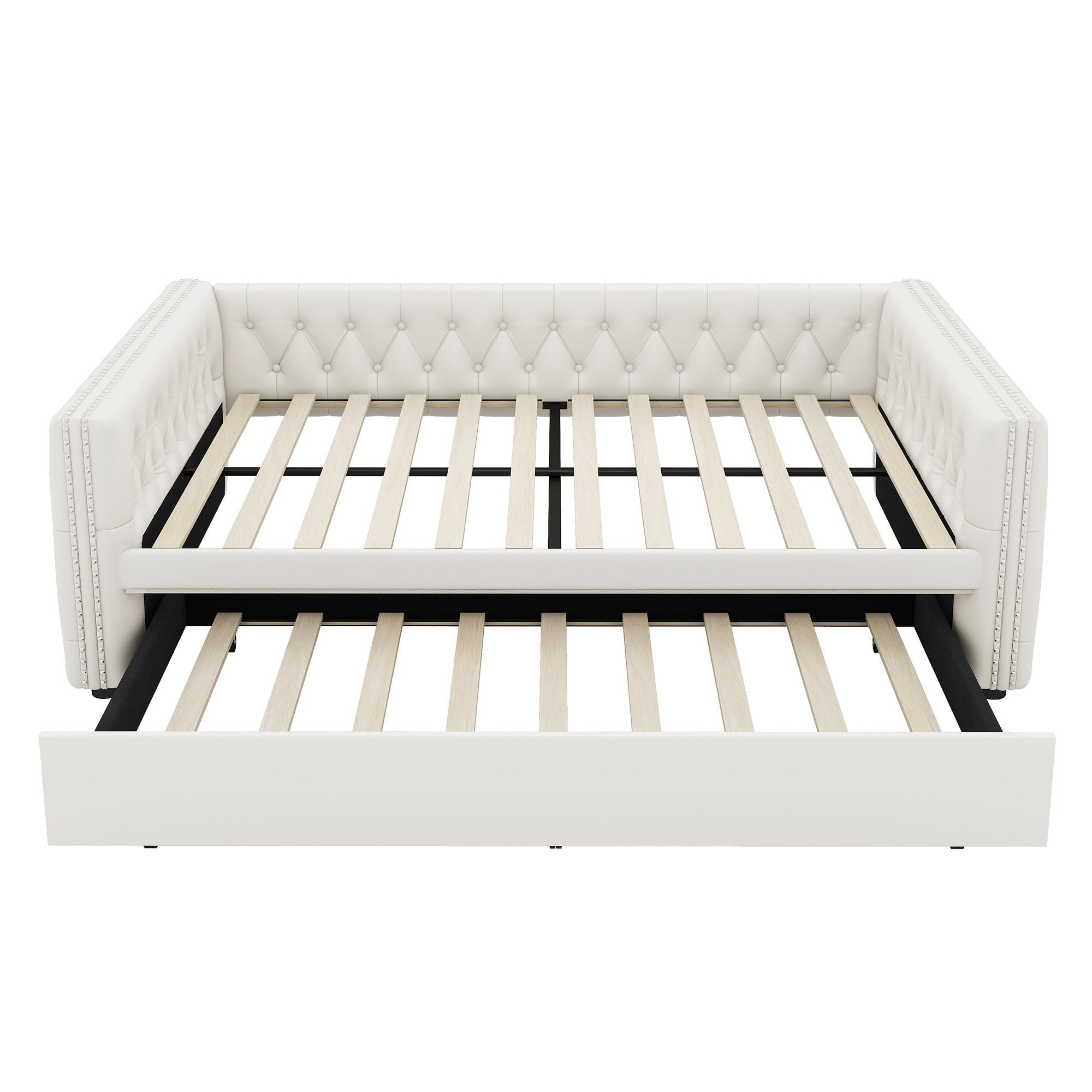 Full Size Daybed, Upholstered Tufted Sofa Bed with Trundle, Daybed with Button & Copper Nail on Square Arms, Full Daybed with Twin Trundle, White