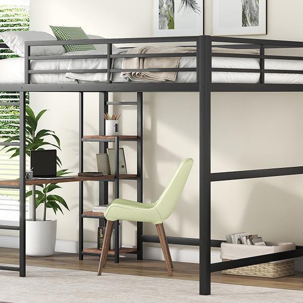 Full Size Metal Loft Bed with Built-in Desk and Storage Shelves, BlackModern and industrial, this loft bed with desk has the space-saving functionality you are looking for to maximize your bedroom. This loft bed is designed with a full-length metal desk surface, making it the ideal spot for you to do their personal works.The desk can be used to store study supplies or to give the room some personalized touches by adding some funky accessories.DescriptionMaterialMetal+MDFSizeFullColorBlackNumbers of Package2Spring BoxNo needAssembly RequiredYesOriginChinaDimensionsOverall Product Dimension77.8''L x 56.2''W x 65.4''HPackage DimensionPlease refer to the SpecificationFull Bed75.4'' x 53.9''Total Height65.4''Number of Bed Slats20pcsRecommend Mattress Thickness of Bed6''Overall Product Weight97lbBed Weight Capacity250lbs[Sturdy Metal Frame] Strong metal frame that includes a ladder, full-length guardrails and secured metal slats to ensure security and stability.[Space Saver] This loft bed is ideal for space-saving needs. There's plenty of room for user customization of the area underneath.Perfect dorm or guest room, or any other limited floor space.[Multifunctional Design] Unlock the possibilities with the loft bed with shelves and desk in full size, which will have you saving space and maximizing functionality with a wide array of features.[Built-in Desk] There is a built-in desk with 4-tier shelves which can be used as your study area or work area.[No Box Spring Required] The metal slats support the mattresses not to slide and increase the service life.