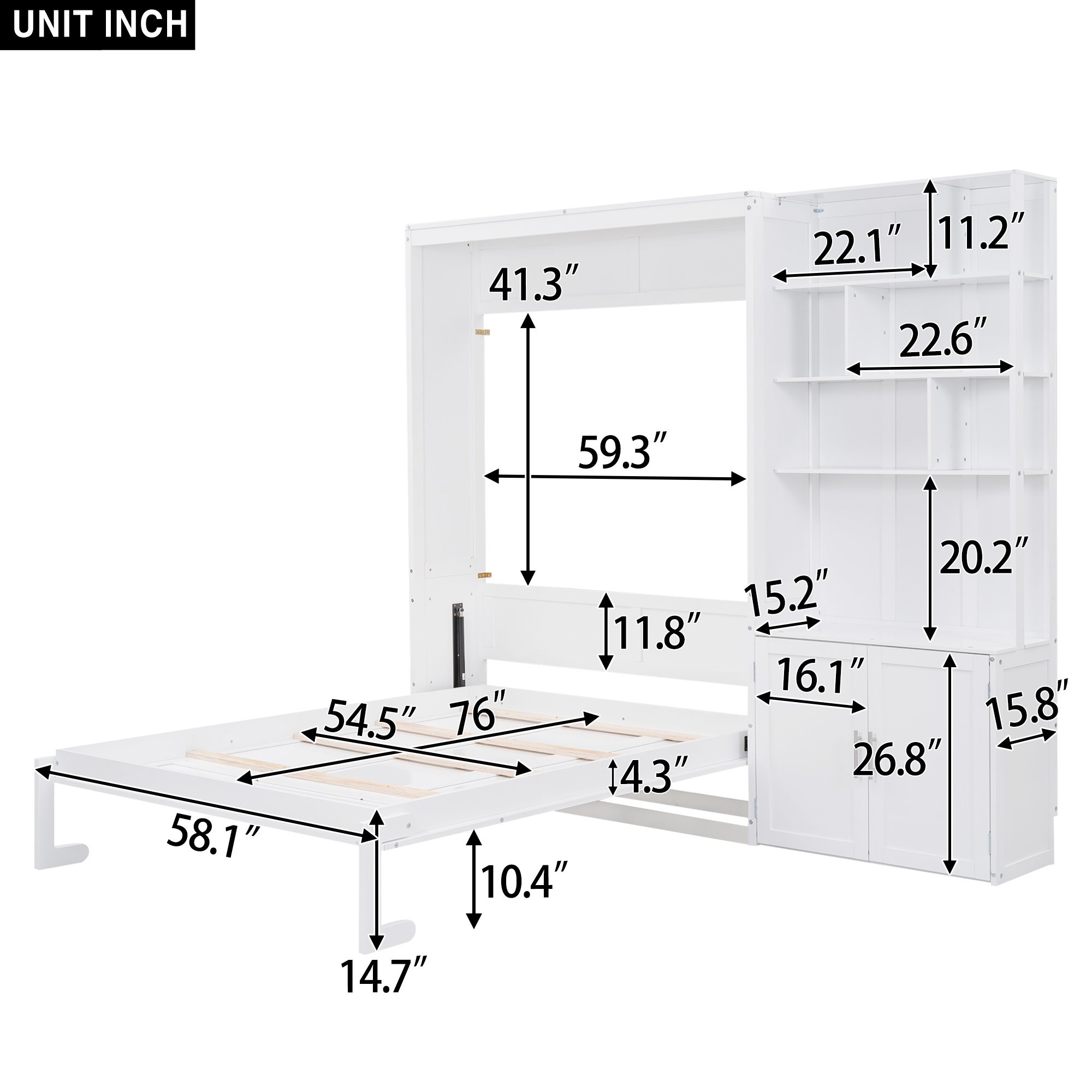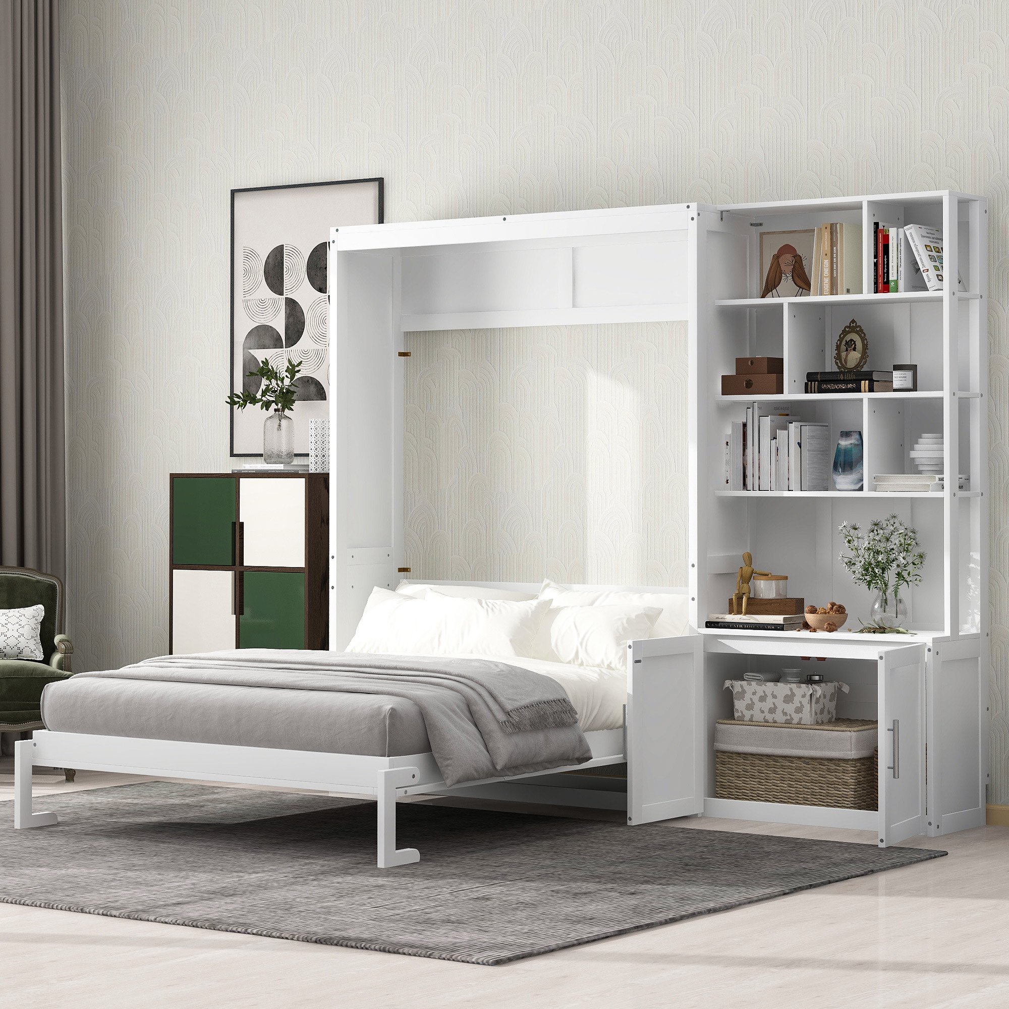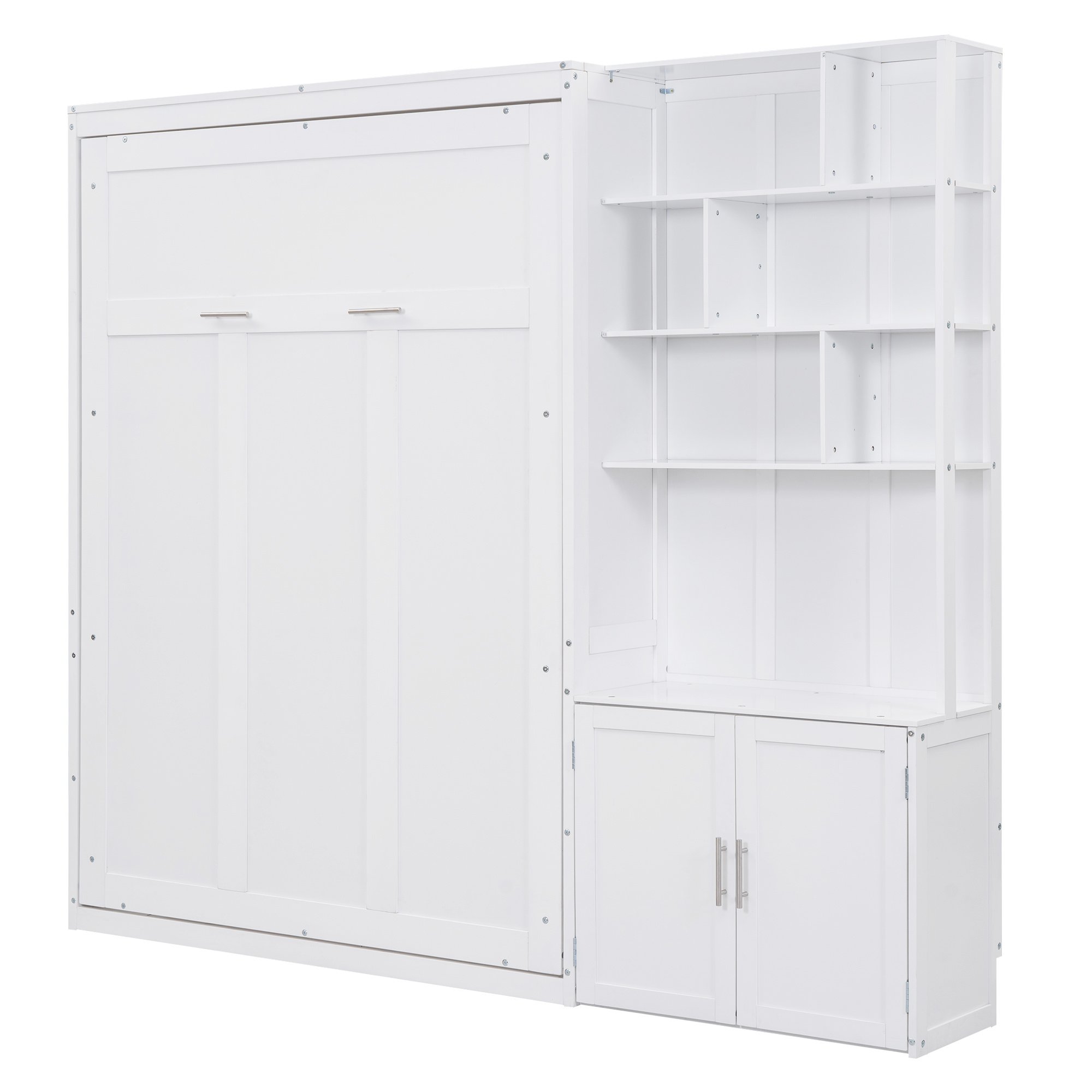 Full Size Murphy Bed with Multiple Storage Shelves and A Cabinet, White