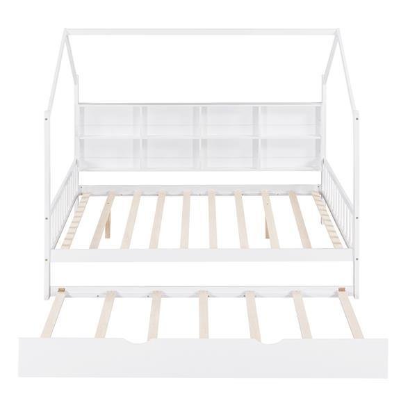 Wooden Full Size House Bed with Trundle,Kids Bed with Shelf, White